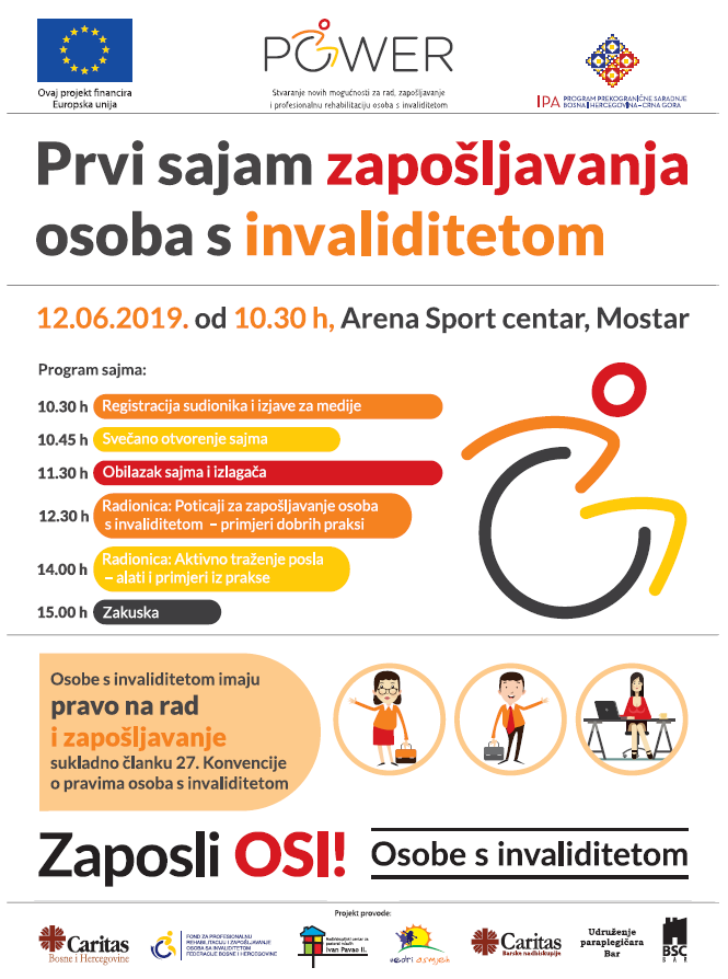 U okviru projekta “POWER” kojeg financira Europska unija, organizuje se prvi sajam zapošljavanja osoba s invaliditetom u BiH. Sajam će se organizirati 12. juna 2019. godine s početkom u 10:30 h u Mostaru, Arena sport centar Mostar. Cilj Sajma je promovirati pravo na rad i zapošljavanje osoba s invaliditetom u skladu sa Konvencijom o pravima osoba s invaliditetom. Tokom Sajma, na konkretnim primjerima pokazat će se kako osobe s invaliditetom imaju pravo na rad te kako mogu ostvariti radni status.