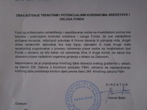 Fond za profesionalnu rehabilitaciju i zapošljavanje osoba sa invaliditetom poziva sve trenutne i potencijalne korisnike sredstava i usluga Fonda, da sve zabilježene slučajeve korupcije, uključujući pokušaje ili činove davanja ili uzimanja mita, drugih oblika nezakonitih djelovanja lica koja trguju utjecajem ili nude druge vrste nezakonitog pogodovanja u procesu ostvarenja prava osoba sa invaliditetom kod Fonda u zamjenu za bilo kakav vid ostvarenja lične ili druge koristi, da takva lica obavezno prijave nadležnim organima gonjenja u skladu sa Zakonom.